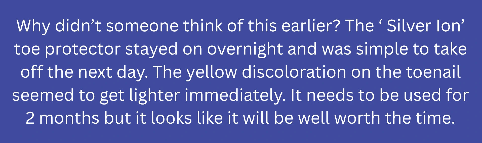 "if you too have a lazy husband with a toenail fungus he just cant seem to treat to kill, get these put them on him nightly and WOW what a difference in 4 weeks we need at least 2 more weeks because he let it go so long but these weird protectors really work"